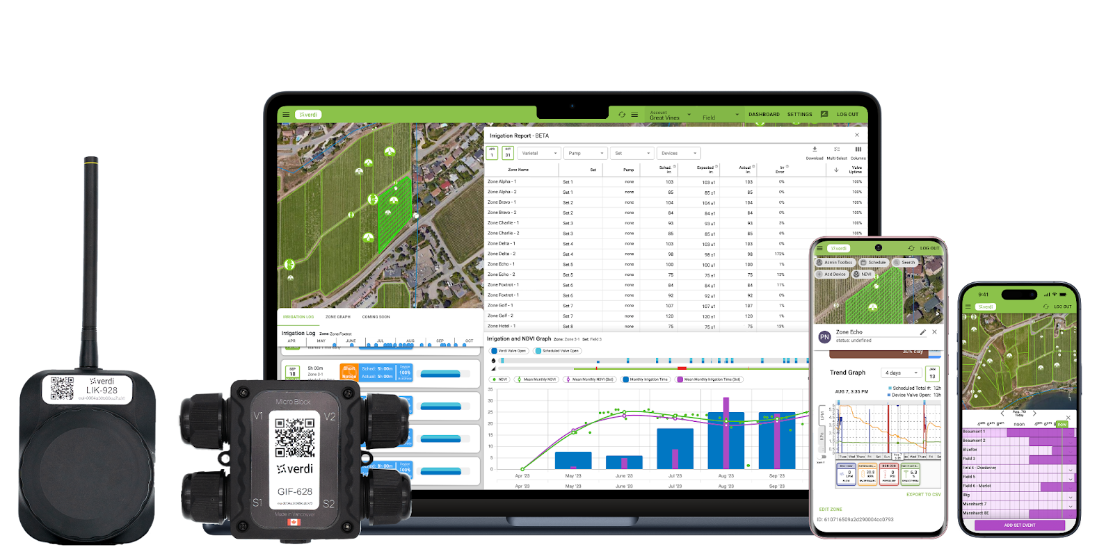 Verdi engineers have developed hardware products with an ultra-low power architecture. This allows for a small integrated device with no requirements for external solar panels or antennas, which means fewer components, a more compact unit and fewer materials. All resulting in an ultra-low cost system that is easily deployed into existing irrigation systems simplifying all aspects of irrigation automation and monitoring to the grower.
